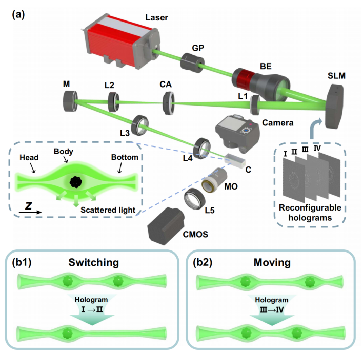针对上述挑战,研究团队基于光场调控的思路,预先设计一系列具有不同位置、数量和开关状态的光学瓶,并利用空间光调制器的动态全息技术,可灵活切换不同光瓶光束,实现对吸光粒子的多功能动态操纵。