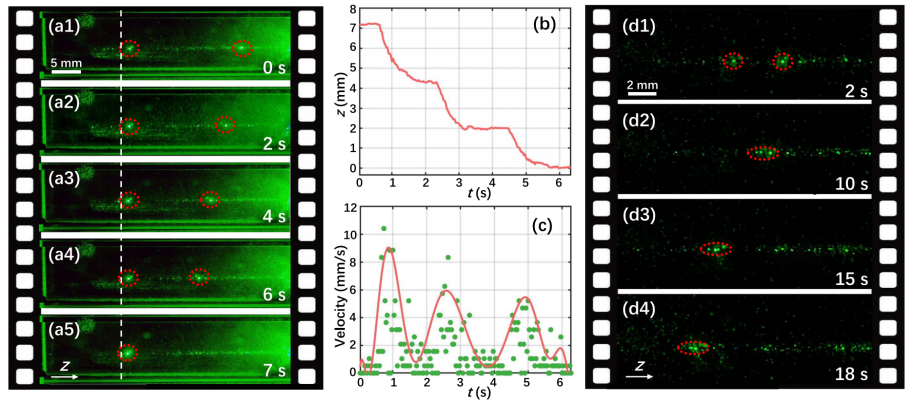 图2 选择性吸光粒子运输、释放,及两部分粒子合并的实验演示